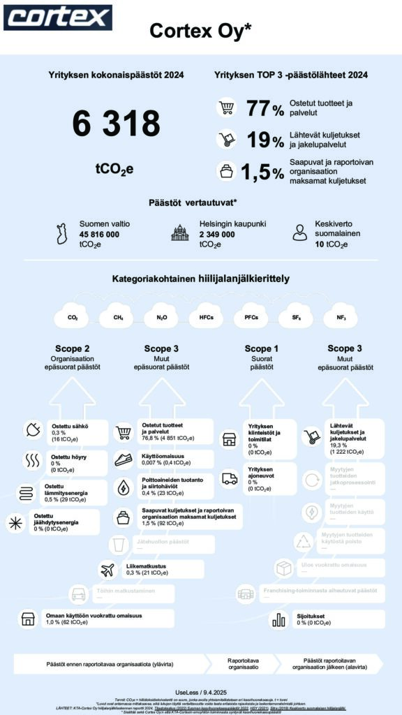 Selvitimme yrityksemme hiilijalanjäljen ensimmäistä kertaa osana KTA-Cortex-yhtymää. Vuoden 2024 hankintaperusteinen hiilijalanjälkemme oli 6 318 tCO2e, joka vastaa noin 630 keskivertosuomalaisen vuotuista hiilijalanjälkeä[1]. Hiilijalanjälkilaskennan toteutti Greenhouse Gas Protocol -standardien mukaisesti ilmasto- ja luontovaikutusten arviointiin erikoistunut asiantuntijatoimisto UseLess Company Oy.
