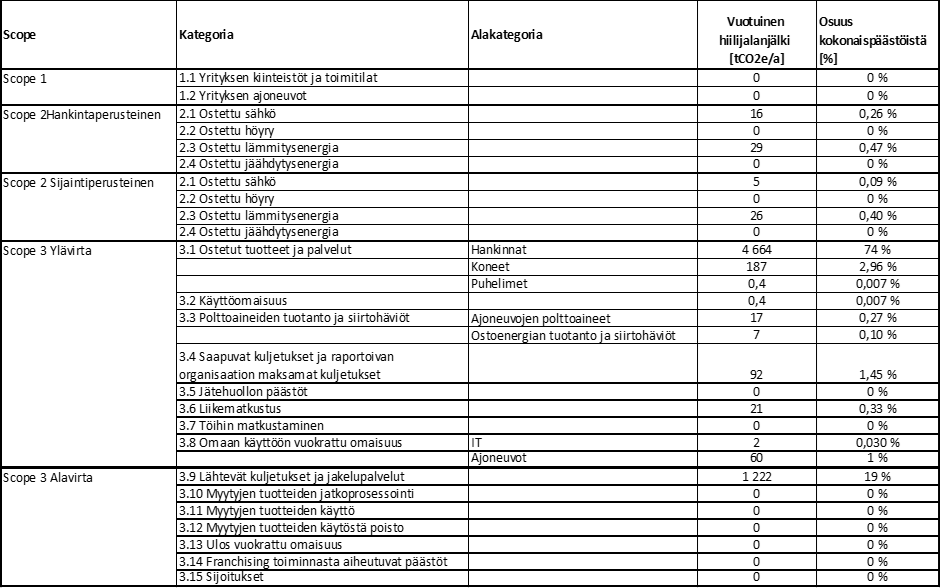 Sisällytimme laskentaamme kaikki toimintamme kannalta merkittäviksi tunnistetut kasvihuonekaasujen päästölähteet. Toimintamme kasvihuonekaasuista 99 % (6 272 tCO2e) syntyi arvoketjussamme (scope 3). Oman toimintamme hiilijalanjälki oli 46 tCO2e (1 %) ja koostui ostoenergiamme tuotannon suorista päästöistä (scope 2).