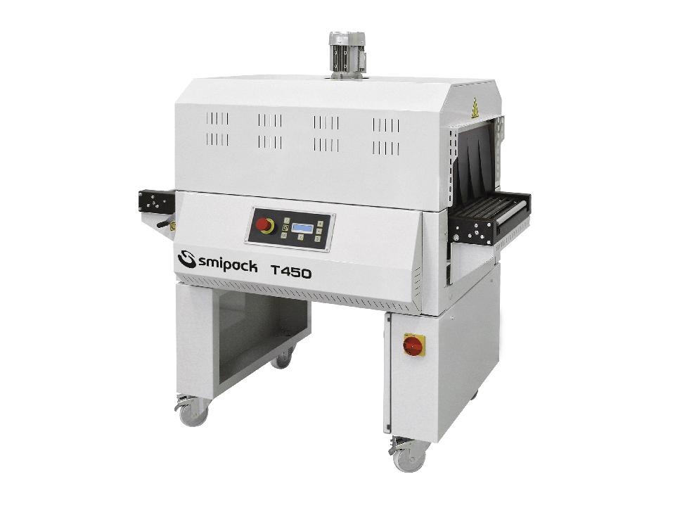 Kutistetunneli Smipack T450, jossa on silikoni päällysteiset kuljetinpuolat kovan lämmönkeston varmistamiseksi.