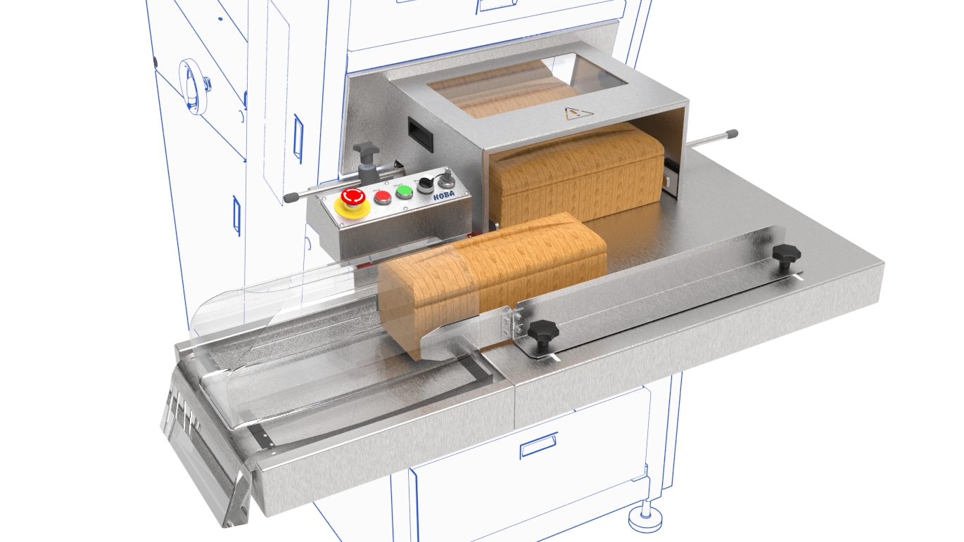 Vakiona ulostulolevy ja sivuohjaimet viipaloitujen leipien syöttämiseksi pakkauslinjalle, ohjattu lopussa valokennolla.